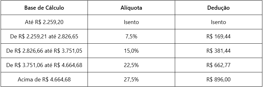 A tabela progressiva foi congelada para este ano e seguirá a mesma tributação do I.R entregue em 2024. Então, a sua incidência será: